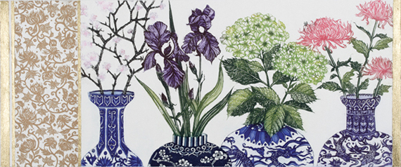 On viewing the superb collection at the Chester Beatty Library, I was particularly struck by the wonderful Asiatic handscrolls, backed and bordered with patterened silk brocade. Further research led me to the importance of floral motifs in Chinese and Japanese art. Apart from their beauty, flowers have symbolic significance or associations with particular times of the year. My image portrays flowers representative of the four seasons; from Plum blossom, which flowers in January in Asia and is associated with winter and the New Year, to the Chrysanthemum, a flower of the ninth month, emblematic of longevity. The title of my etching 'Flora Japonica' arises from the botanical term applied to plants whose origins stem from China or Japan.